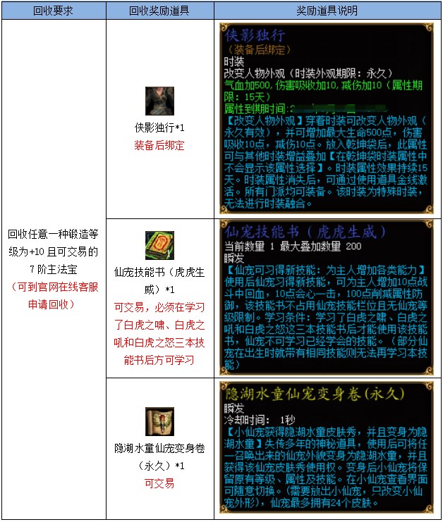 3、每回收1件满足指定要求的7阶主法宝,给予1件装备后绑定的“侠影独行”、1个可交易的“仙宠技能书(虎虎生威)”、1个可交易的“隐湖水童仙宠变身卷(永久)”,不设上限;