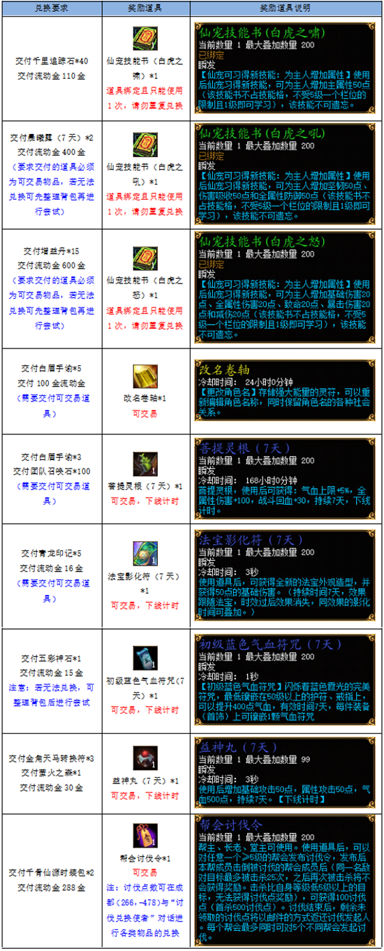 2、兑换获得的道具中,除【白虎之啸】、【白虎之吼】、【白虎之怒】这三本技能书为绑定,其余道具均可进行交易;