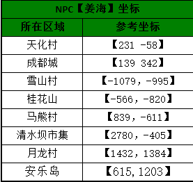 1、 玩家可在天化村【231,-58】处或其他重要城镇找到NPC【姜海】,具体位置如下表所示: