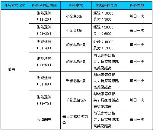 1、玩家除了能通过钓鱼获得相应的物品以外,还能通过NPC【姜海】接取一些特殊的任务,其中包括了每日任务,具体如下表所示: