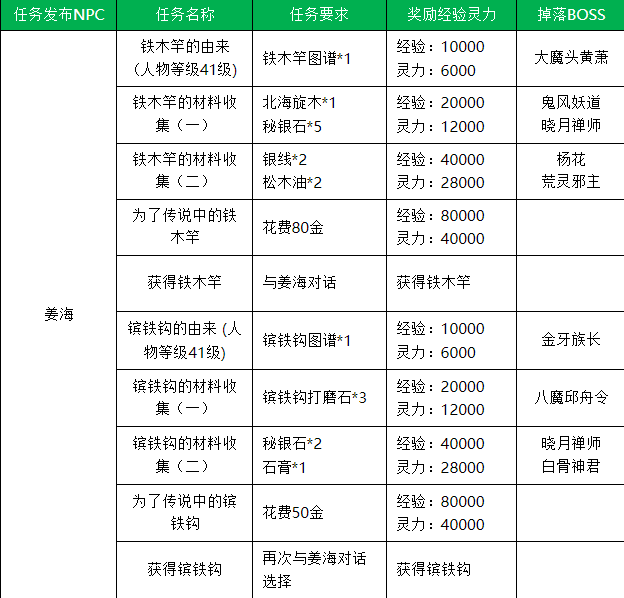 3、 另外玩家还可以通过商城购买或NPC【姜海】所发布的一系列任务获得更加高级的鱼竿,任务如下表所示: