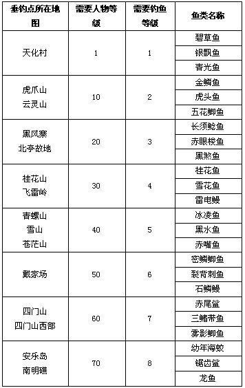 2、 玩家可根据自己等级情况、钓鱼等级情况以及所需鱼的种类选择不同的垂钓点,具体如下表所示: