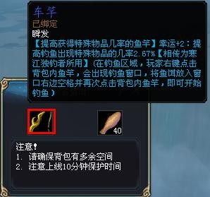 2、在界面内会显示出鱼竿的种类和所剩的鱼饵数量,同时在垂钓开始之前,需要注意确保背包内有剩余的空间。如下图所示: