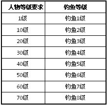 2、当钓鱼技能熟练度达到标准后可提升钓鱼等级,玩家的钓鱼技能等级与角色等级挂钩,如下表所示:
